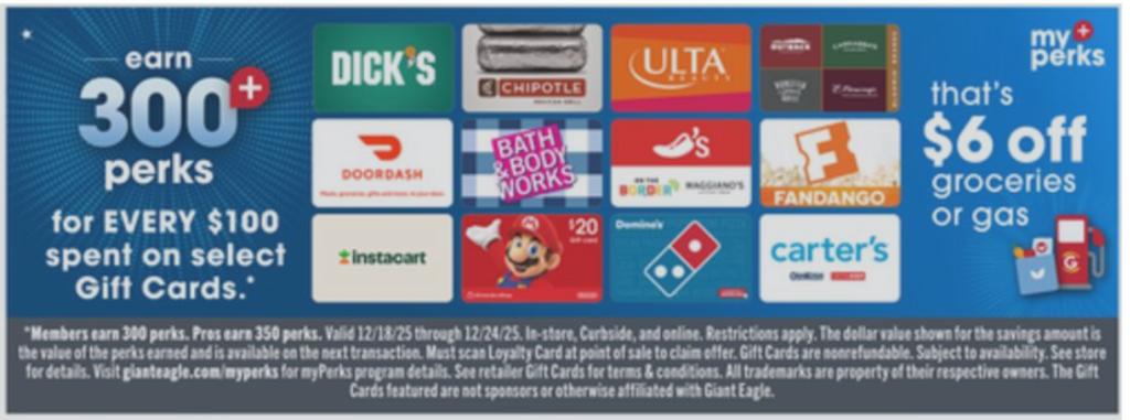 Members earn 300 Perks (Pros earn 350) for every $100 you spend on gift cards (that’s $6 off gas or groceries):