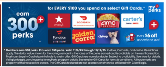 Members earn 300 Perks (Pros earn 350) for every $100 you spend on the following gift cards (that’s $6 off gas or groceries):