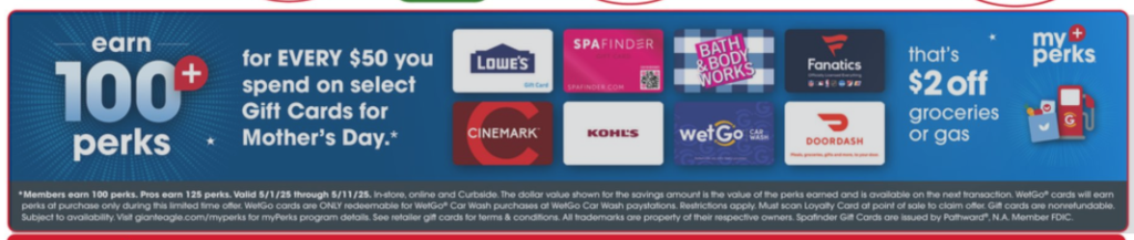 Members earn 100 Perks, Pros earn 125, in-store, Curbside and online for every $50 you spend on the following gift cards (That saves you $2 off gas or groceries):