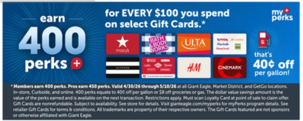 Giant Eagle/Market District/GetGo (In-Store, Curbside and Online): Buy $100 Macy’s, Bath & Body Works, Ulta, TJ Maxx, Sephora, Focus Brands, H&M or Cinemark Gift Cards and Get 400 Perks
