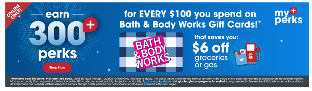 [EXPIRED] Giant Eagle (Online Only): Buy $100 Bath & Body Works Gift Cards and Get 300 Perks