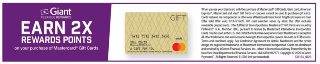 - Giant card, Mastercard, Visa Gift Cards and American Express cards or coupons cannot be used to purchase gift cards