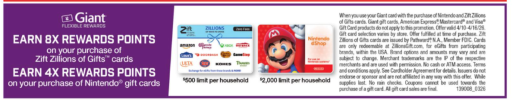 - Giant card, Mastercard, Visa Gift Cards and American Express cards or coupons cannot be used to purchase gift cards