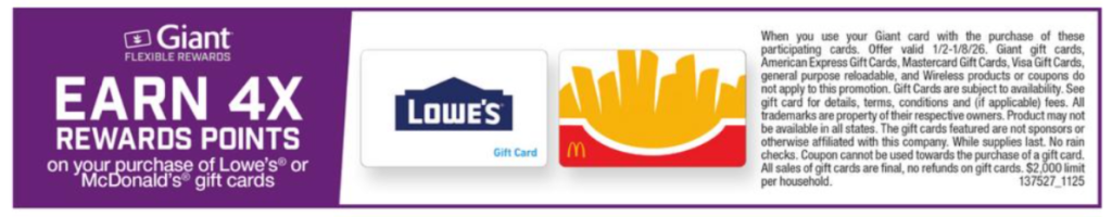 - Giant card, Mastercard, Visa Gift Cards and American Express cards or coupons cannot be used to purchase gift cards