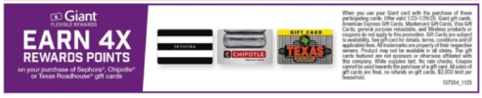 Giant Food: Earn 4X Flexible Rewards Points on Sephora, Chipotle and Texas Roadhouse Gift Cards