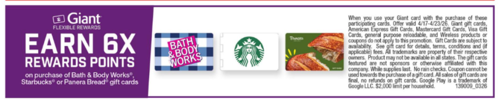 Giant Food: Earn 6X Flexible Rewards Points on Bath & Body Works, Starbucks and Panera Bread Gift Cards