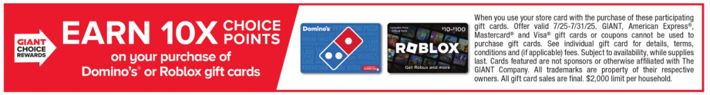 [EXPIRED] Giant/Martin’s: 10X Choice Points on Domino’s and Roblox Gift Cards