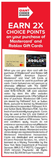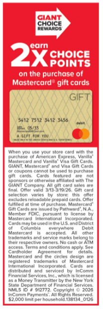 - Giant Gift Cards, American Express, Mastercard and Vanilla Visa gift cards cannot be used to purchase gift cards