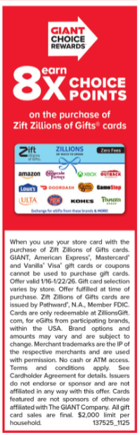 [EXPIRED] Giant/Martin’s: 8X Choice Points on Zift Zillions of Gift Cards