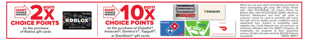 One Comment on “[EXPIRED] Giant/Martin’s: Earn 10X Choice Points on Instacart, Domino’s, DoorDash, Topgolf and Chipotle Gift Cards”
