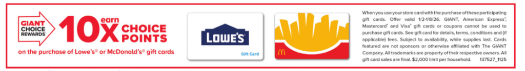 - Must use your Giant card with the purchase of these participating gift cards