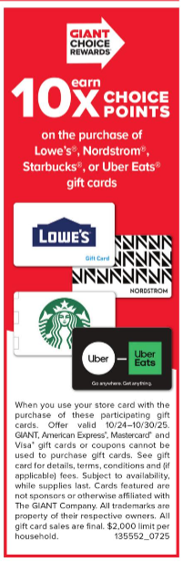 [EXPIRED] Giant/Martin’s: Earn 10X Choice Points on Lowe’s, Nordstrom, Starbucks and Uber Gift Cards