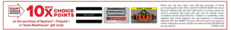 - Must use your Giant card with the purchase of these participating gift cards