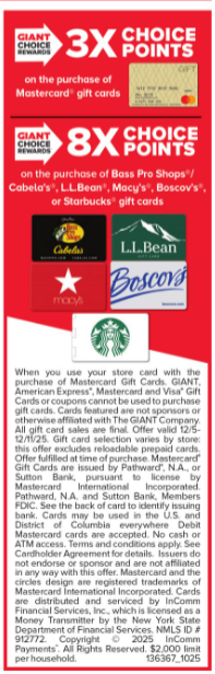 - Earn 3X Choice Points on Mastercard Gift Cards