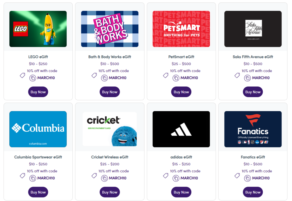 You can use Giftcards.com eGift cards to pay for your third party gift card purchases, as well as earn Giftcards.com Rewards for most brands.