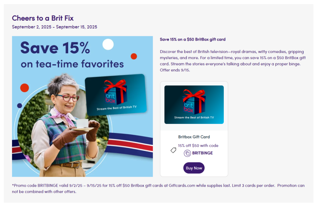 Save 15% on a $50 BritBox gift card with promo code: BRITBINGE