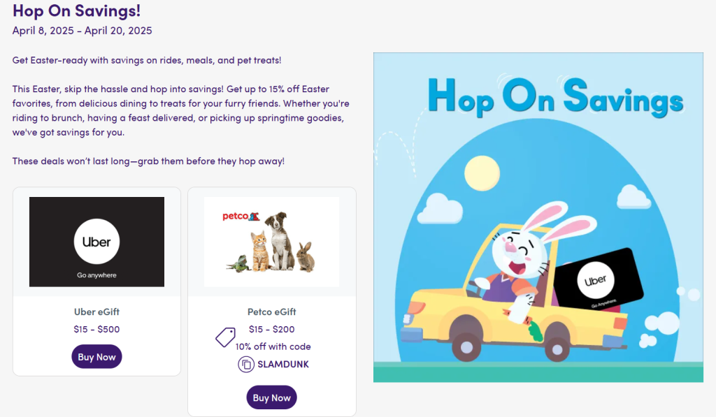 - 10% off $100 Uber or Uber Eats gift cards – Promo code BUNNYRIDES