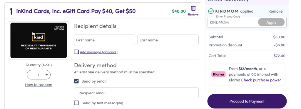 10% off inKind gift cards with promo code KINDMOM on purchases of $40 or more, plus there is another inKind promotion: Pay $40, Get $50, but it’s unclear if using the code will invalidate the $10 bonus.