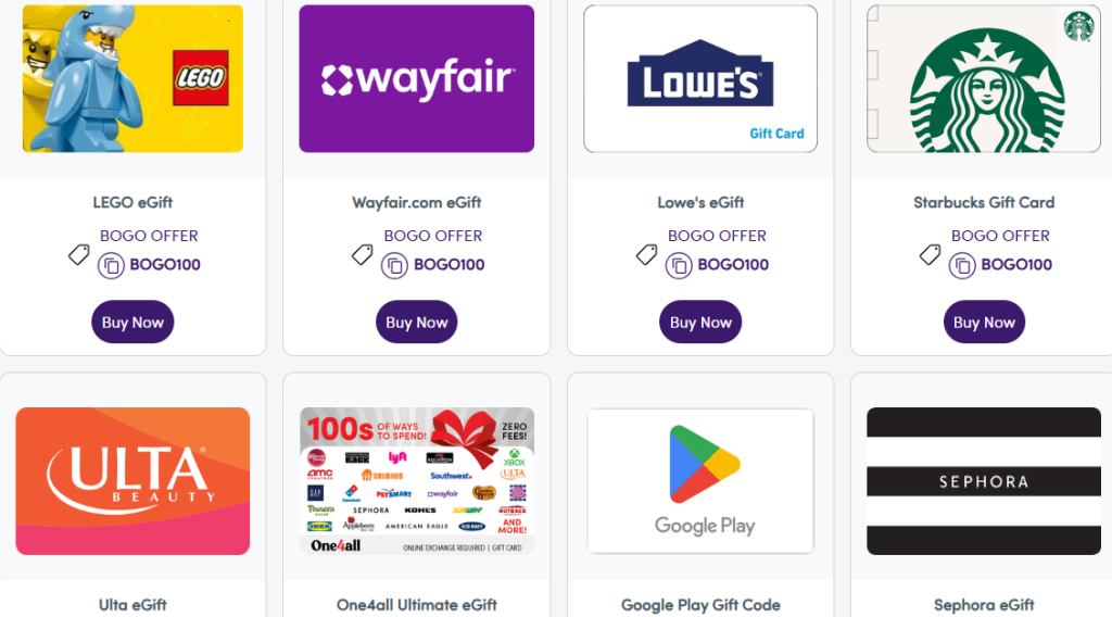 - The $10 Giftcards.com Gift Card Buy One Get One (BOGO) promotion, available with the use of code BOGO100, applies exclusively to the purchase of select $100 gift cards at Giftcards.com