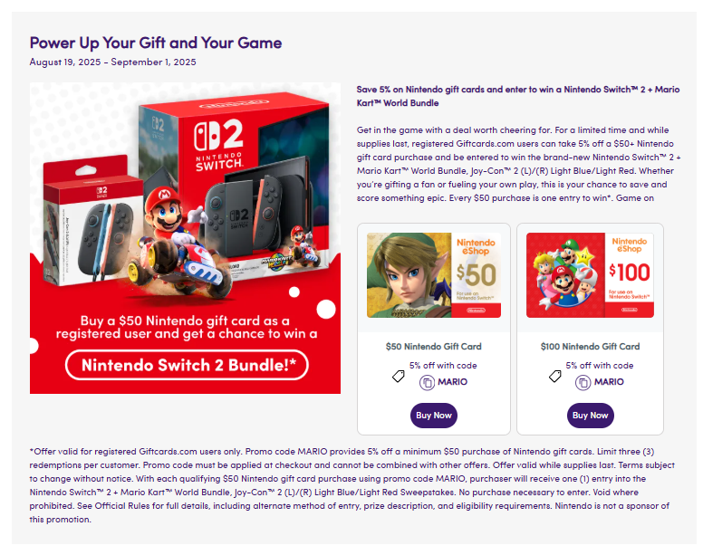Save 5 10% on Nintendo gift cards and enter to win a Nintendo Switch™ 2 + Mario Kart™ World Bundle. Promo code MARIO minimum $50 purchase of Nintendo gift cards. With each qualifying $50 Nintendo gift card purchase using promo code MARIO, purchaser will receive one (1) entry into the Nintendo Switch™ 2 + Mario Kart™ World Bundle, Joy-Con™ 2 (L)/(R) Light Blue/Light Red Sweepstakes.