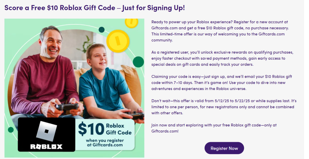 Giftcards.com: Register New Account and Get a $10 Roblox Gift Card Free