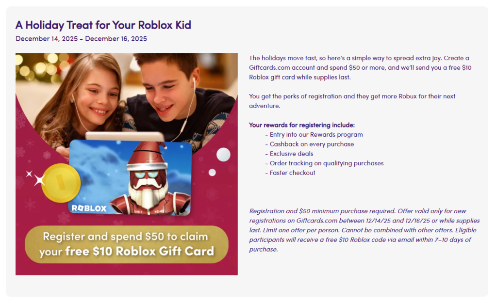 Register and spend $50 to claim your free $10 Roblox Gift Card.