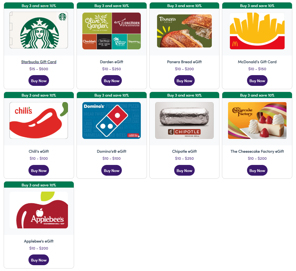 Buy bundles of 3 or more in the following gift cards and save 10%:
