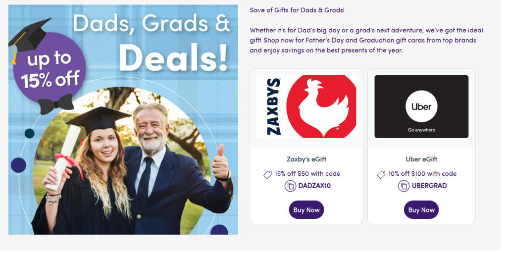 [EXPIRED] Giftcards.com: Save Up to 15% on Select Gift Cards With Promo Codes GRADSDAD, DADZAX10, UBERGRAD, DADYUMM and GRAVY10