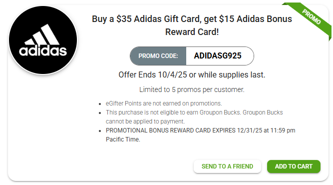 Buy a $35 Adidas Gift Card, get $15 Adidas Bonus Reward Card! Promo Code: ADIDASG925