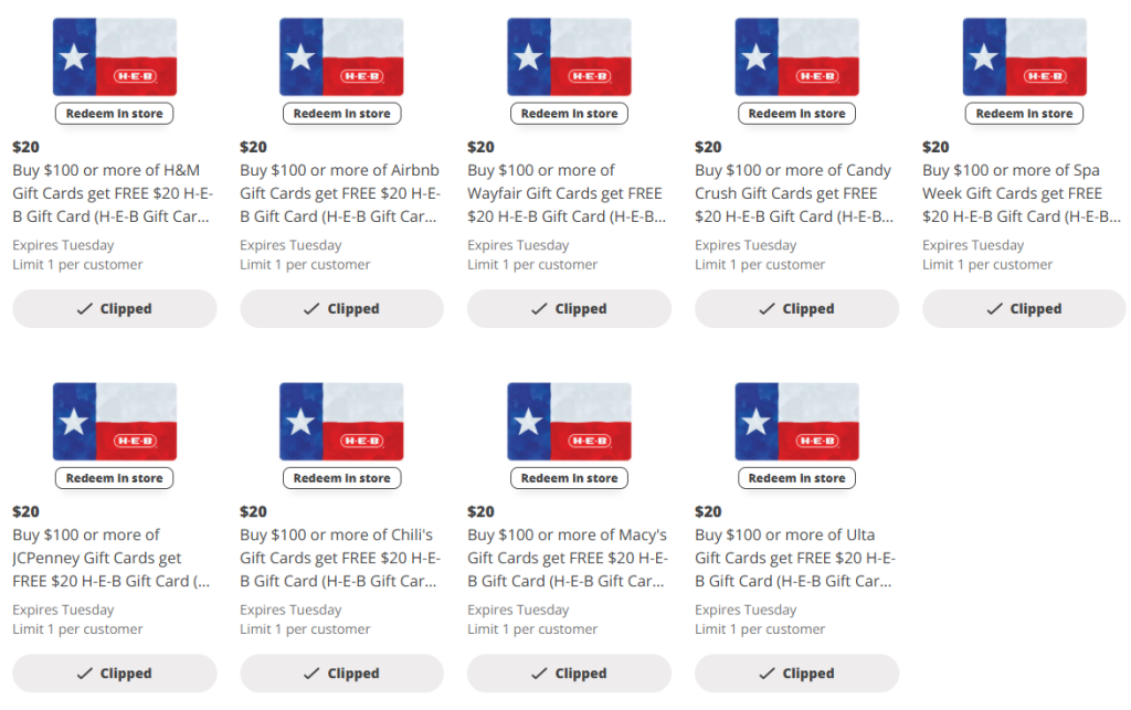 Buy $100 or more of any of the following gift cards and get a $20 H-E-B card free (H-E-B Gift Card must be included in order):