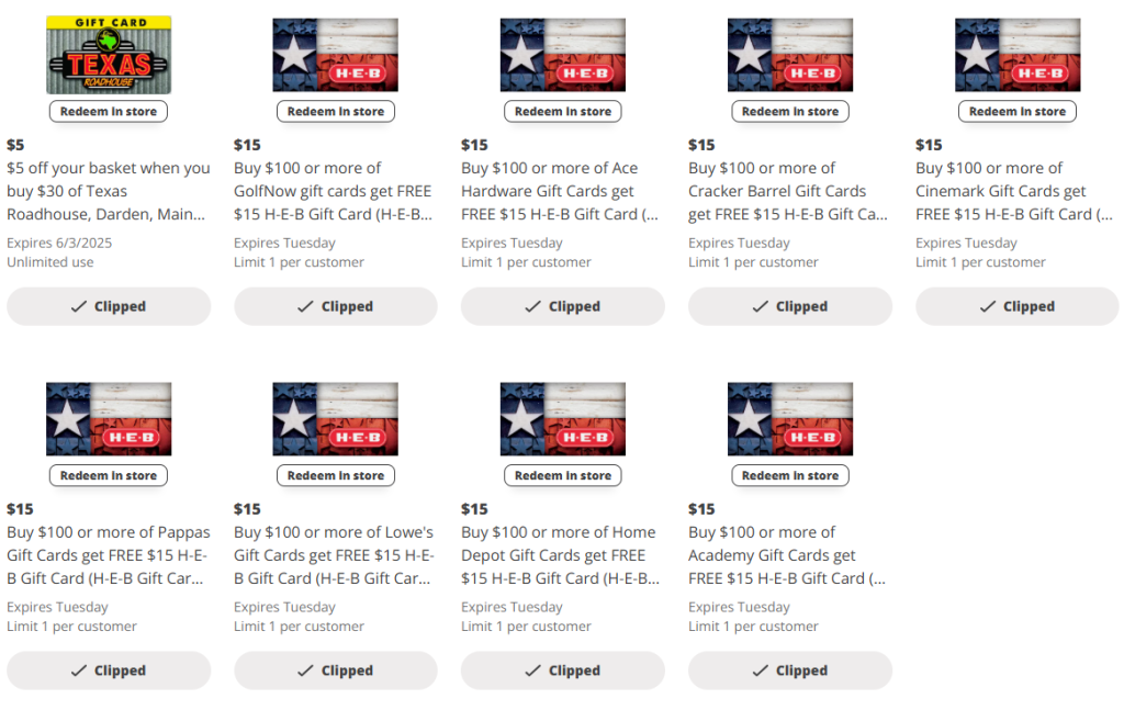 - Unlimited use for $5 off grocery basket coupon, 1 time use for $15 H-E-B gift card coupons