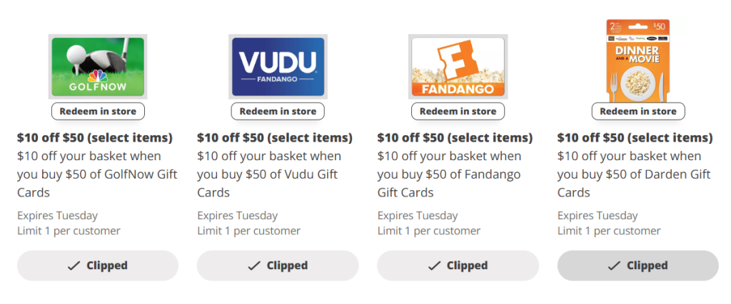 $10 off your basket when you buy $50 of the following gift cards:
