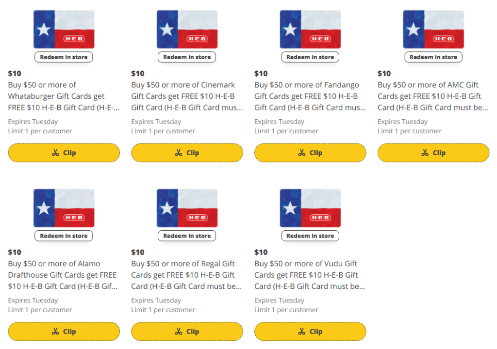 [EXPIRED] H-E-B: Buy $50 Whataburger, Cinemark, Fandango, AMC, Alamo Drafthouse, Regal or Vudu Gift Card and Get a $10 H-E-B Gift Card FREE