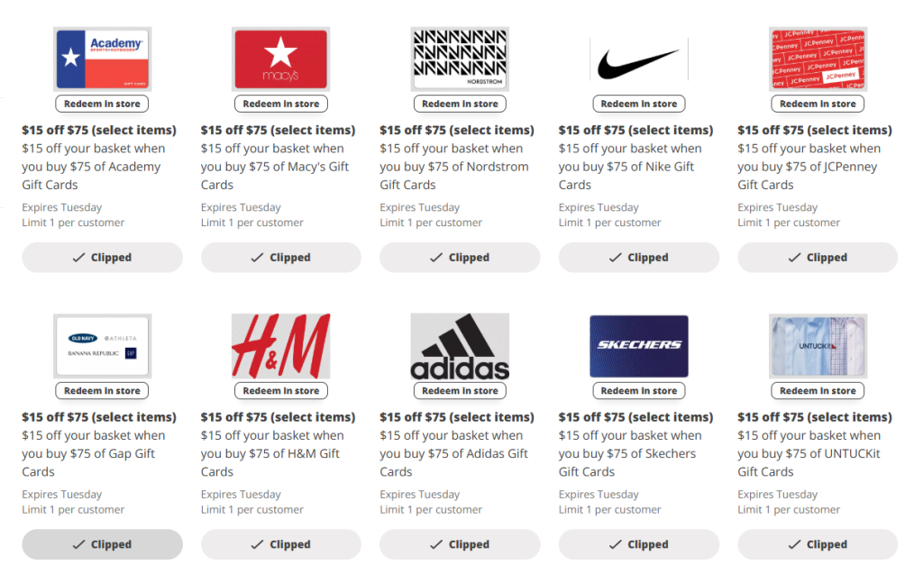 [EXPIRED] H-E-B: Buy $75 Academy, Macy’s, Nordstrom, Nike, JCPenney, Gap, H&M, Adidas, Sketchers or UNTUCKit Gift Cards and Get $15 Off Your Grocery Basket