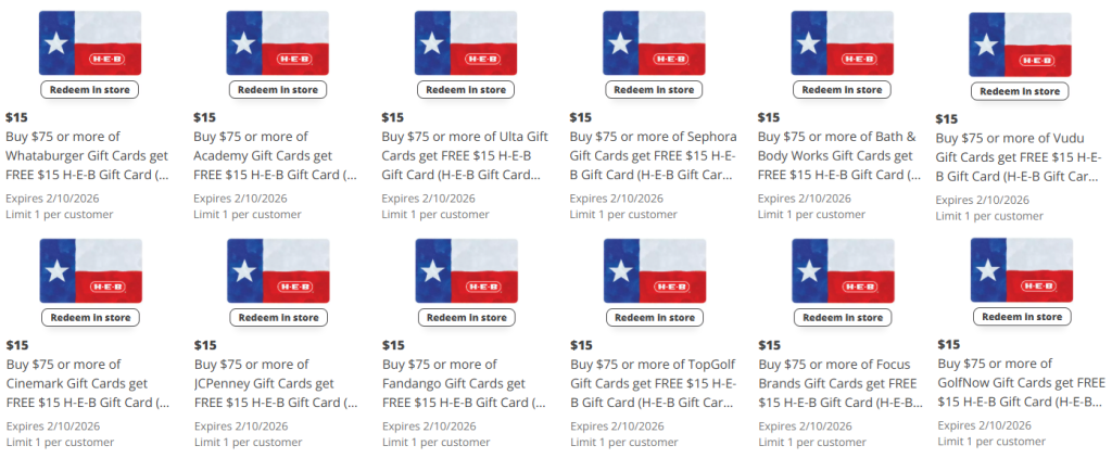 Buy $75 of the following gift cards and get FREE $15 H-E-B Gift Card (H-E-B Gift Card must be included in order):