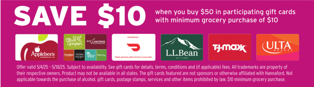 Save $10 when you buy $50 in the following gift cards with a minimum grocery purchase of $10: