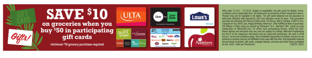 - Save $10 when you buy $50 in gift cards for these participating brands: