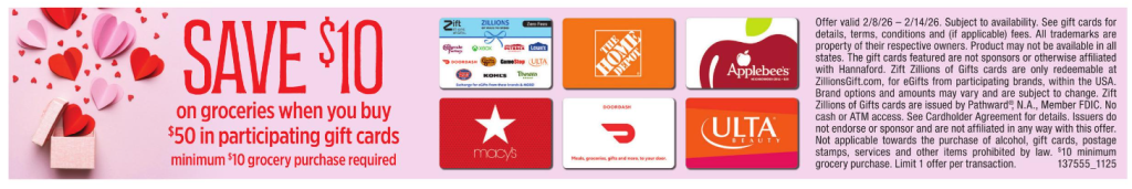 Hannaford: Buy $50 in Zift Zillions, Home Depot, Applebee’s, Macy’s, DoorDash or Ulta Gift Cards and Save $10 on Groceries
