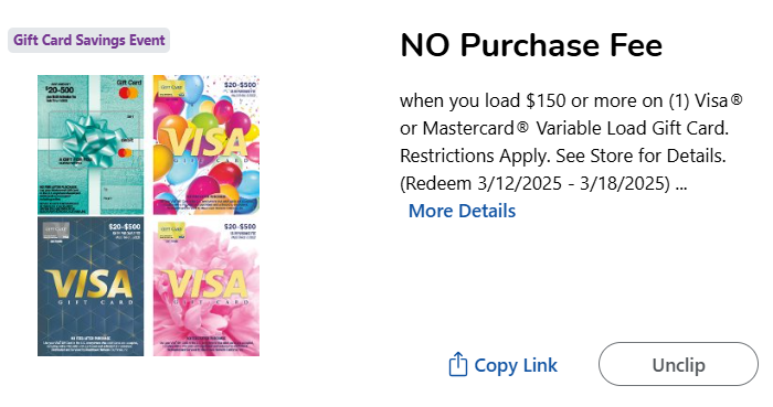 No purchase fee when you load $150 or more on (1) Visa® or Mastercard® Variable Load Gift Card