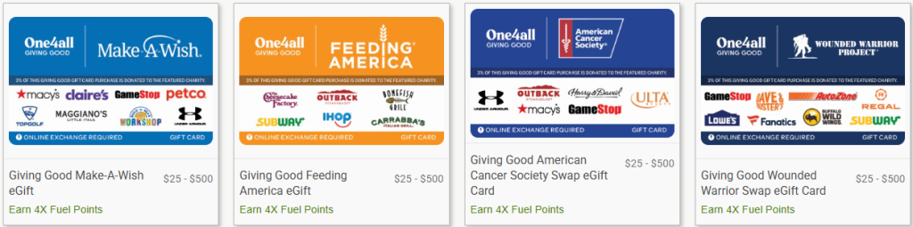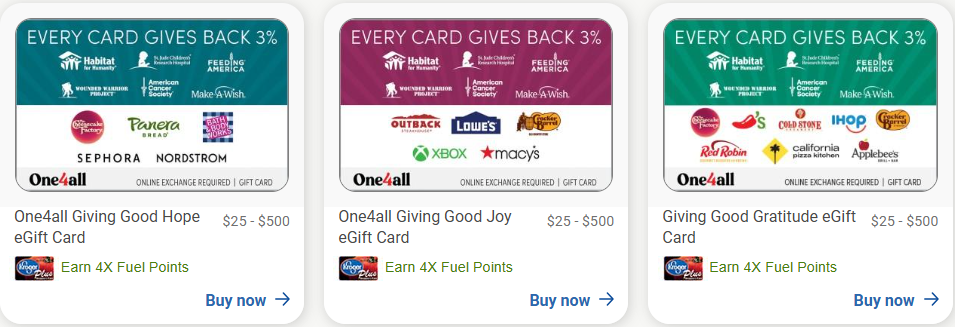 In addition (though it is not new), both Kroger and Harris Teeter gift card websites offer the newer kind of convertible gift cards that say “EVERY CARD GIVES BACK 3%” and list all six of these non-profits on the front. However, none of these can be converted to Best Buy or Home Depot. Also, unlike the older Giving Good gift cards associated with individual charities, these explicitly show One4all branding.
