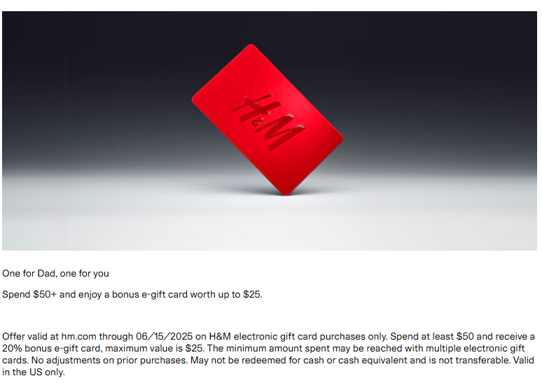 - Offer valid at hm.com on H&M electronic gift card purchases only