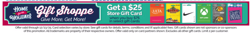 Get a $25 store gift card when you buy $75 in the following gift cards: