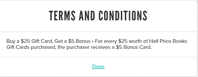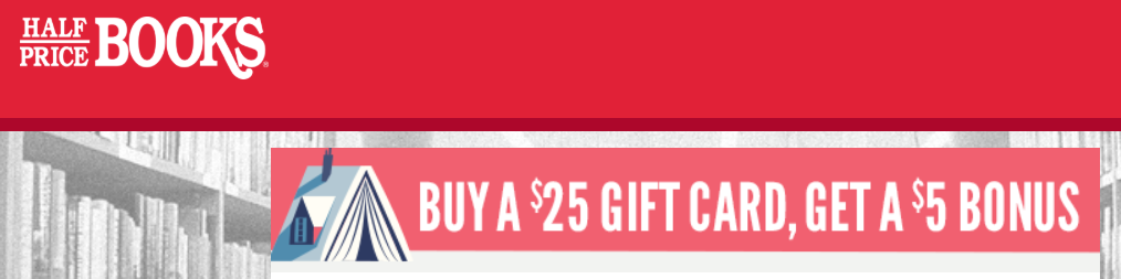- For every $25 worth of Half Price Books Gift Cards purchased, the purchaser receives a $5 Bonus Card.
