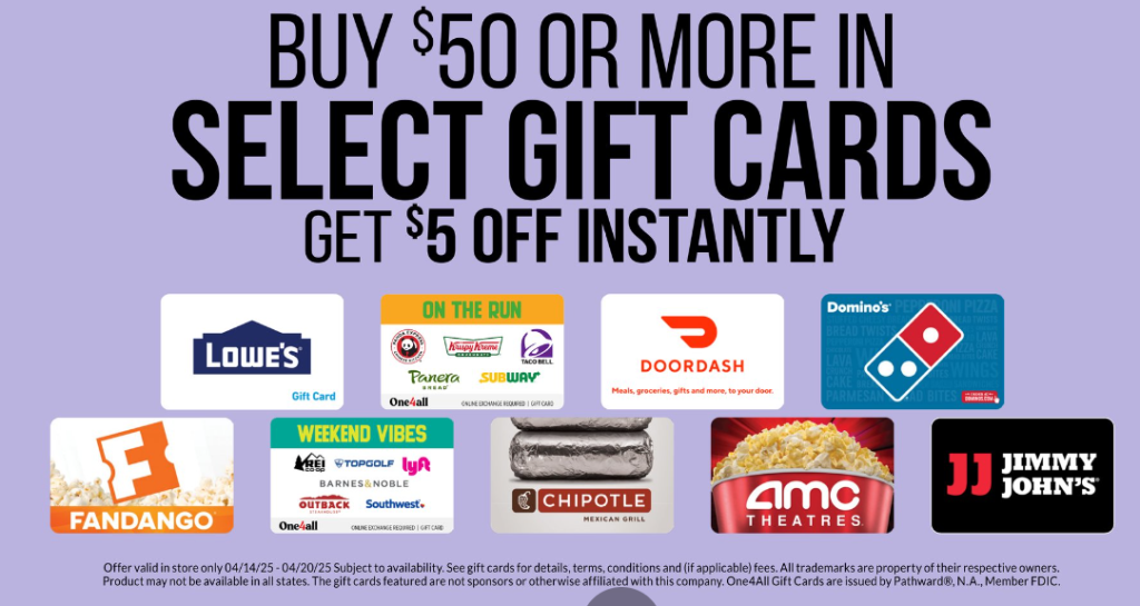 Buy $50 or more in the following gift cards and get $5 off instantly: