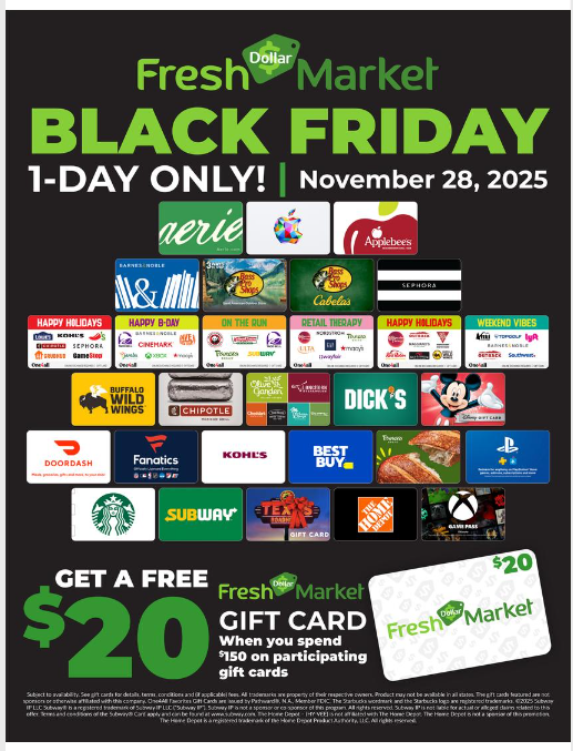 Get a free $20 Hy-Vee gift card with every $150 spent on participating gift cards. Valid brands include: