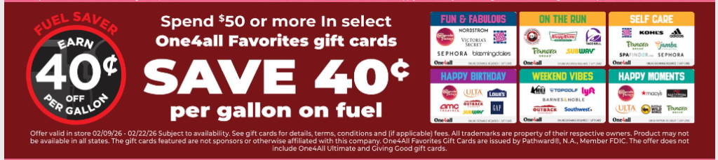 Spend $50 in select One4All Favorites gift cards and Save 40c per gallon