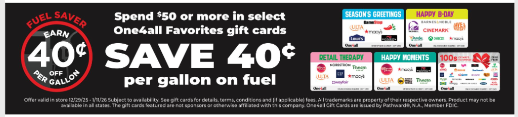 Spend $50 in select One4All Favorites (and maybe One4All Ultimate?) gift cards and Save 40c per gallon