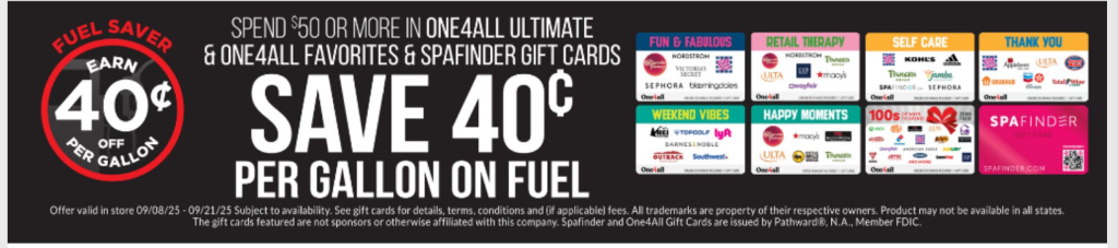 Purchasing One4All Ultimate, One4All Favorites and Spafinder cards earn you 40c off per gallon for every $50 you purchase.