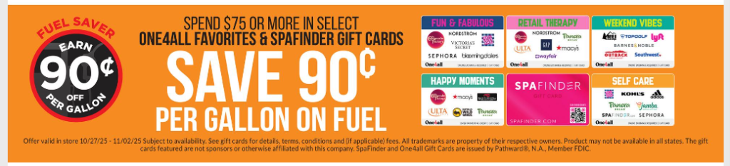 Spend $75 or more in One4All Favorites and Spafinder Gift Cards and Save 90c per Gallon
