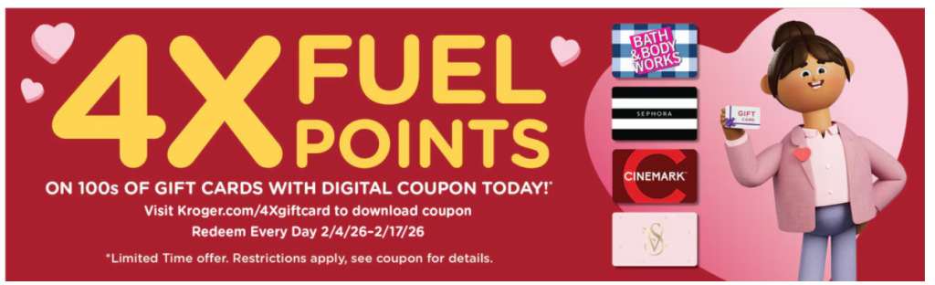 Kroger (including Kroger-affiliated chains) is offering 4x fuel points on all third party gift cards (excluding Amazon) and fixed value Visa and Mastercard gift cards ($25, $50 or $100)